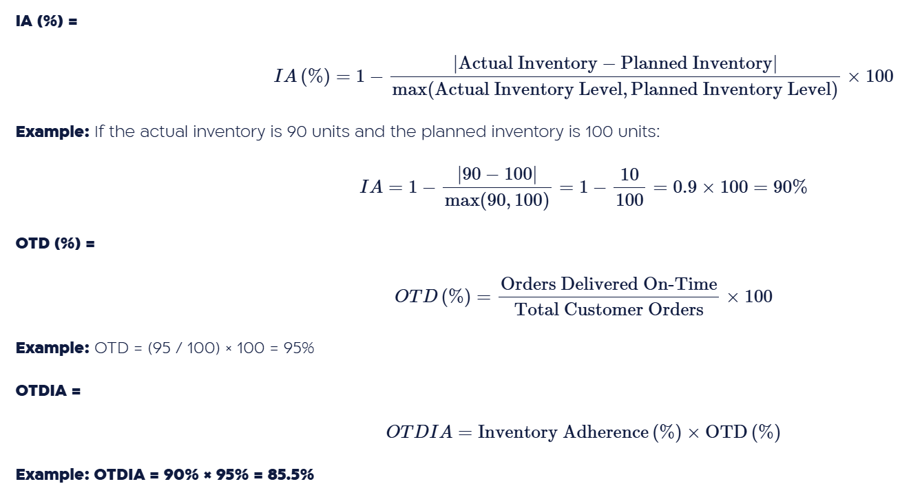 To address this conflict, we propose a combined KPI called OTDIA. Calculated by multiplying on-time delivery (OTD) with inventory adherence (IA), OTDIA aligns both teams towards a shared objective of balancing inventory levels with customer satisfaction.